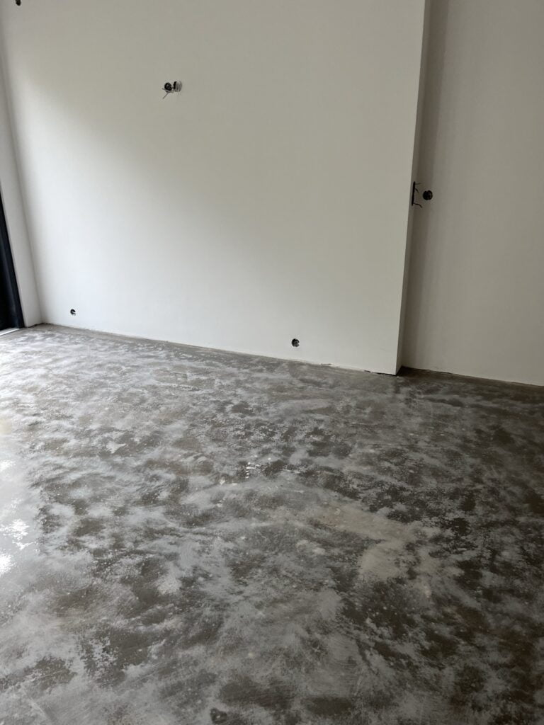 In dit project hebben we de gietvloer aangebracht in de woonkamer en keuken. De opbouw van de lagen omvatte eerst een primerlaag. Daarna hebben we een epoxy schraplaag aangebracht, gevolgd door de PU gietvloer met betonlook en mineralen. Tot slot hebben we de vloer twee keer afgelakt met een extra matte topcoat.