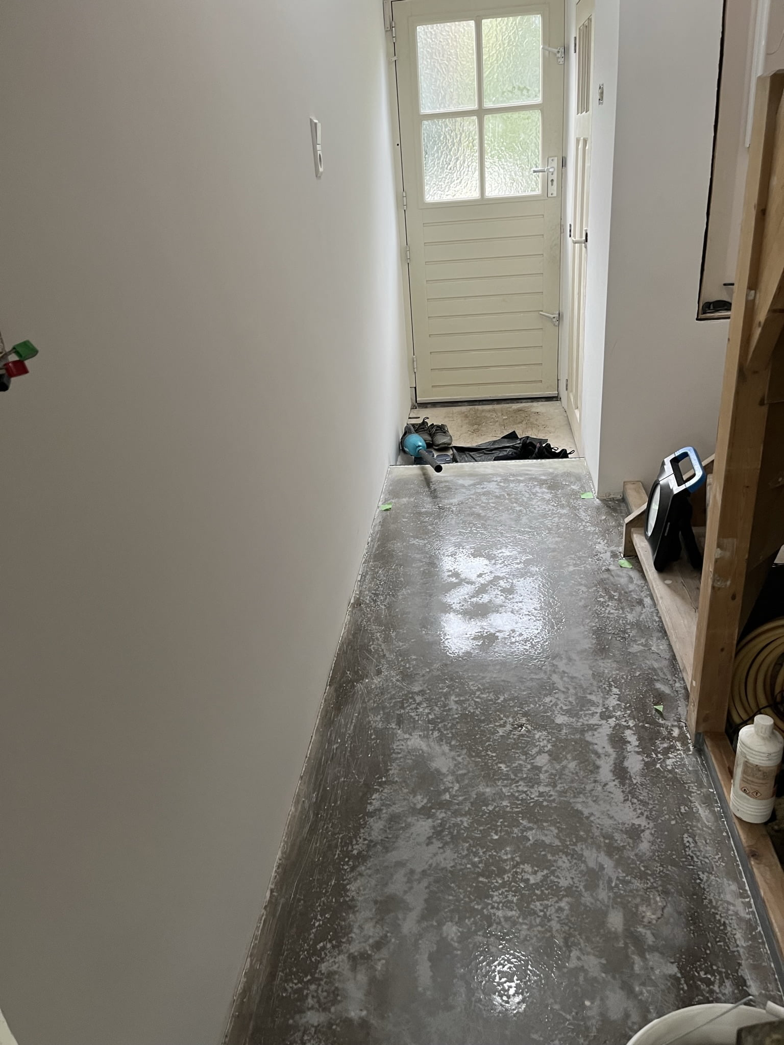 In dit project hebben we de gietvloer aangebracht in de woonkamer en keuken. De opbouw van de lagen omvatte eerst een primerlaag. Daarna hebben we een epoxy schraplaag aangebracht, gevolgd door de PU gietvloer met betonlook en mineralen. Tot slot hebben we de vloer twee keer afgelakt met een extra matte topcoat.